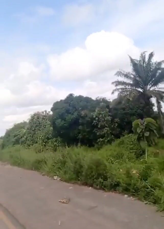 The video captures a road journey on a gray asphalt road with a yellow line on the left shoulder and a white line in the center. The roadside is covered with green grass and dense vegetation, including palm trees and various other trees. Above, the sky is blue with scattered white clouds. The camera appears to be mounted on a vehicle in motion, traveling along the road. The focus shifts from the immediate roadside vegetation to the distant horizon as the vehicle progresses. The background suggests a rural or countryside setting. There are no people or other vehicles visible.