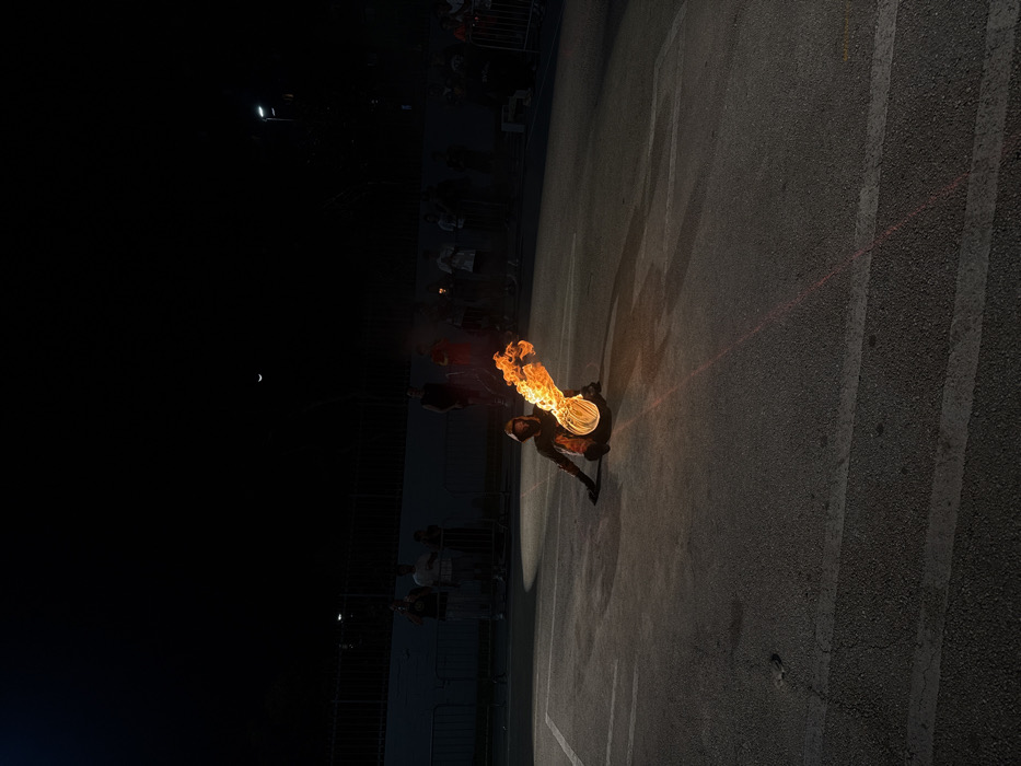 - "A performer, engulfed in flames, spins a fiery orb on a dark asphalt surface, likely a parking lot or performance area" by FM-7iQU13, licensed under CC BY 4.0