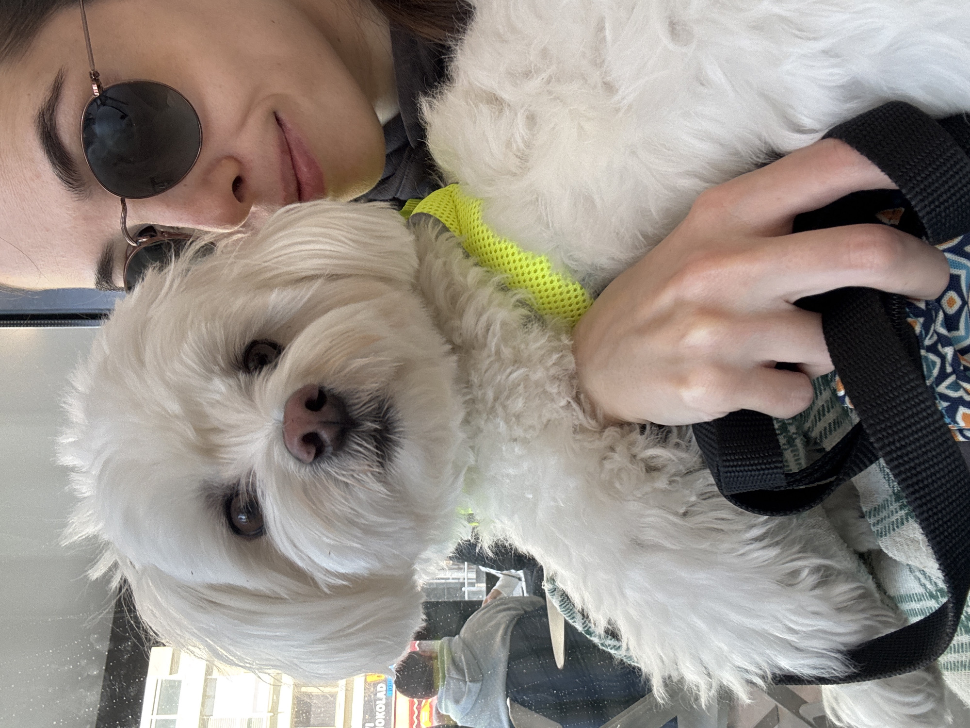 The image captures an indoor scene, likely a cafe, in Bat Yam, Israel. A small, white, fluffy dog, appearing to be a Maltese or similar breed, is centrally positioned, looking directly at the viewer. The dog has dark eyes, a pink nose, and wears a neon yellow mesh harness. The dog is held by a female individual whose right profile is visible on the right side of the frame. She wears round, dark-lensed sunglasses with thin metal frames and a dark-colored garment on her shoulder. A slight smile is discernible on her lips. Her left hand is visible, holding a black strap that appears to be part of a bag or carrier, resting on a patterned blue and orange fabric that covers a green and white plaid material. In the blurred background, seen through a glass partition, another person is seated at a table, facing away, wearing a gray hoodie with a light green or yellow interior lining visible at the hood. Beyond this, an urban environment with multi-story buildings and a partially visible red and white storefront sign displaying "VI" and "KOLAD" is present.