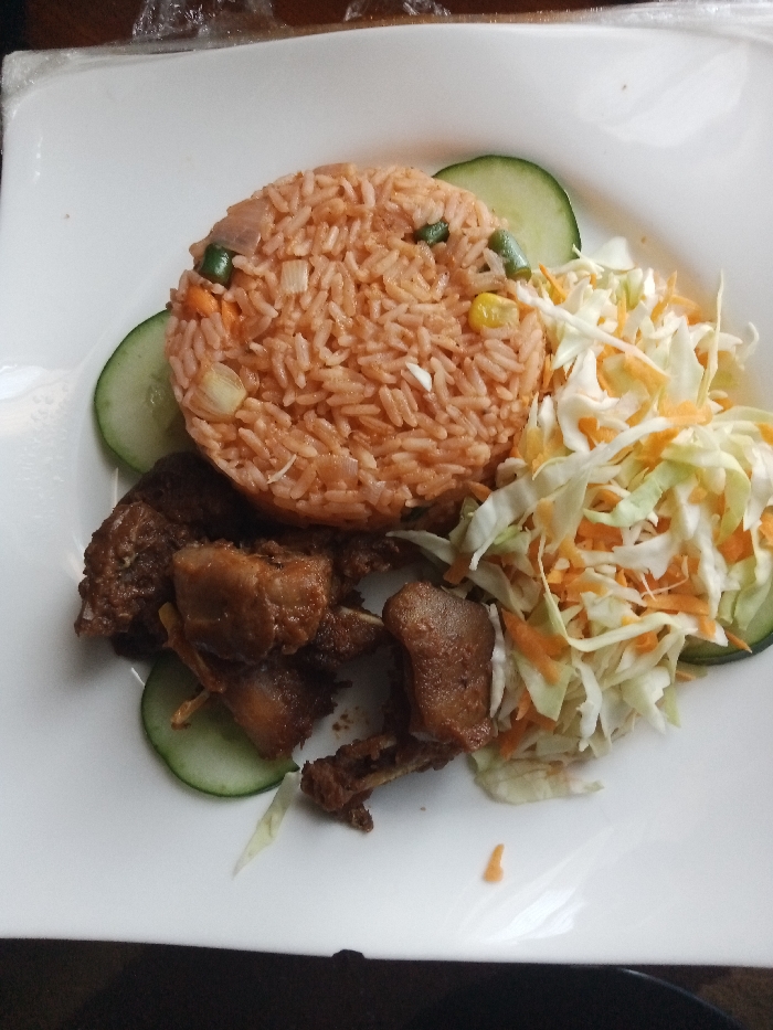 The scene depicts a prepared meal served on a white, rectangular plate with subtly curved edges. Location: Unknown, Unknown. The primary subject is an oval-shaped mound of reddish-orange Jollof rice, prominently positioned towards the upper-center. The rice contains visible inclusions of diced onions, green peas/beans, corn kernels, diced carrots, and small, white, irregular pieces that appear to be scrambled egg. To the lower-left of the rice, several irregularly shaped, dark brown pieces of stewed or grilled meat are arranged. These pieces exhibit varied textures, and some appear to be bone-in. To the right of the rice, a distinct pile of shredded white cabbage and grated orange carrots forms a side salad. Four round, green cucumber slices are arranged around the meal, serving as garnish and an additional side, with two visible on the left and two on the right. The background is dark and out of focus, indicating an indoor dining setting, possibly on a dark table surface, with a faint, blurry hint of a transparent plastic-covered item in the upper-left corner. No individuals or specific actions are depicted.