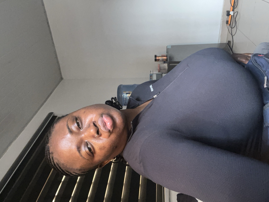 A woman in a black form-fitting outfit poses for a selfie, her face tilted towards the camera, lips slightly pursed. She has braided hair and a nose ring. Light streams through the blinds, casting shadows across her face. In the background, a water cooler, a small shelf with copper-colored items, an air conditioning unit, and some electrical cords are visible. A blue bag rests behind her.