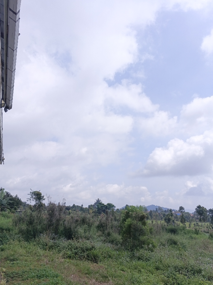 This image depicts an outdoor landscape, likely in the city of Man Gyat, Myanmar, characterized by a mix of natural vegetation and a partially cloudy sky. The upper left corner shows a grey, sloped building structure, possibly a roof or overhang, with visible gutters and eaves, indicating an adjacent man-made presence. The sky occupies approximately the upper two-thirds of the frame, displaying numerous white and light grey cumulus clouds against a pale blue background, suggesting a partially overcast day. The lower third of the image is dominated by dense, varied green vegetation, including tall grasses, shrubs, and numerous trees of varying heights and foliage densities. Some areas of the vegetation appear wild and overgrown. In the distant background, a faint line of hills or mountains is visible under the clouds, interspersed with what appear to be very distant structures or buildings. No individuals, animals, or specific actions are visible within the frame.