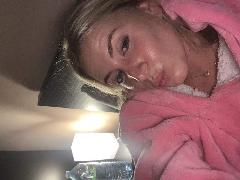 A woman with blonde hair and light skin is lying down, facing the camera. She's wearing a pink, fluffy hooded garment and has on a delicate necklace. Her lips are slightly puckered. Behind her, a dark shelf is visible along with a bright, geometric lamp, and a water bottle rests on a surface below. The image is somewhat dimly lit.