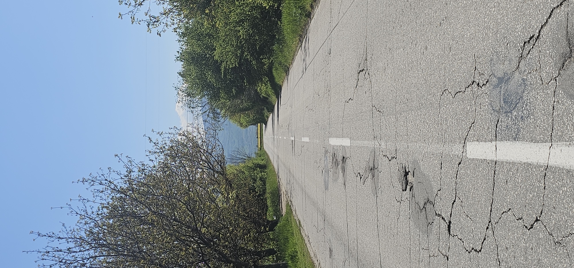 n asphalt road stretching into the distance in Krumovo, Bulgaria. The road has a single white line marking the center. The asphalt is cracked and shows signs of wear and repair. Trees and foliage line both sides of the road. In the distance, the horizon shows a body of water and a suggestion of hills or mountains. The sky is blue with few clouds. There are no people or animals visible in the image.