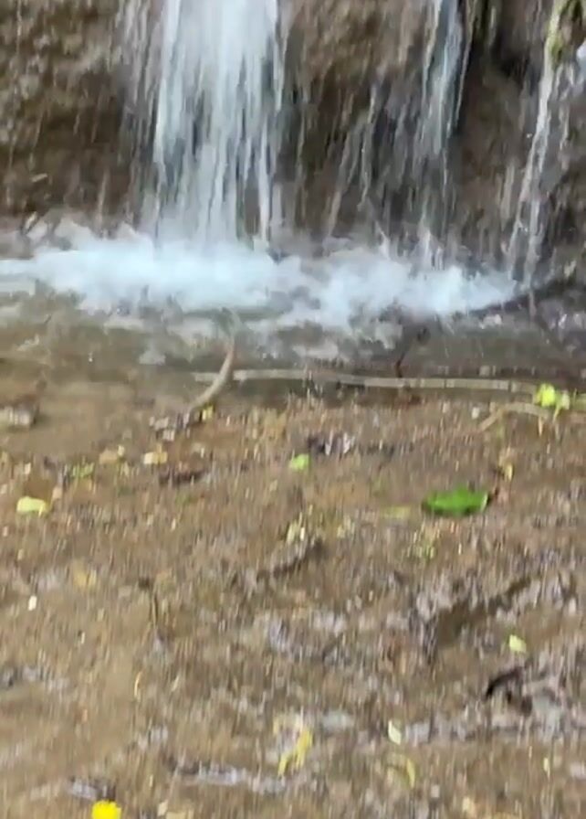 small waterfall cascading over a rock face. The water flows into a shallow pool below. The surrounding area is muddy, and there are some small plants and leaves scattered around. A tree trunk is visible on the right side of the frame.
