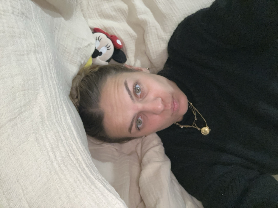 A woman with light brown hair and green eyes lies on her side on a light beige, textured bedspread. She wears a dark sweater and a layered gold necklace with a medallion. A small Minnie Mouse plush toy rests near her head on a pillow. Her expression is neutral, looking directly at the camera. The lighting suggests an indoor setting, and the image is oriented slightly diagonally.