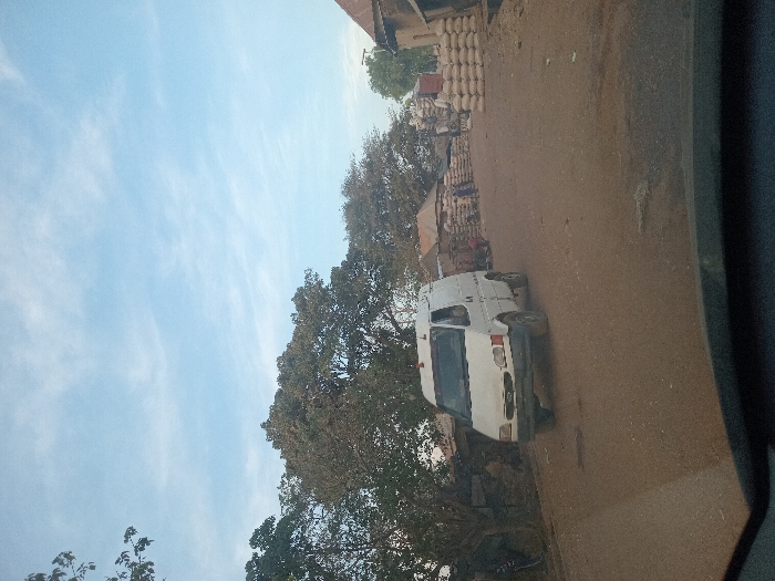A white van is parked on a dusty road lined with trees. Stacks of unidentified bags are visible near a building in the background. The sky is blue with scattered clouds, and a portion of the vehicle capturing the image is visible on the right. The angle suggests the image was taken from inside another vehicle.