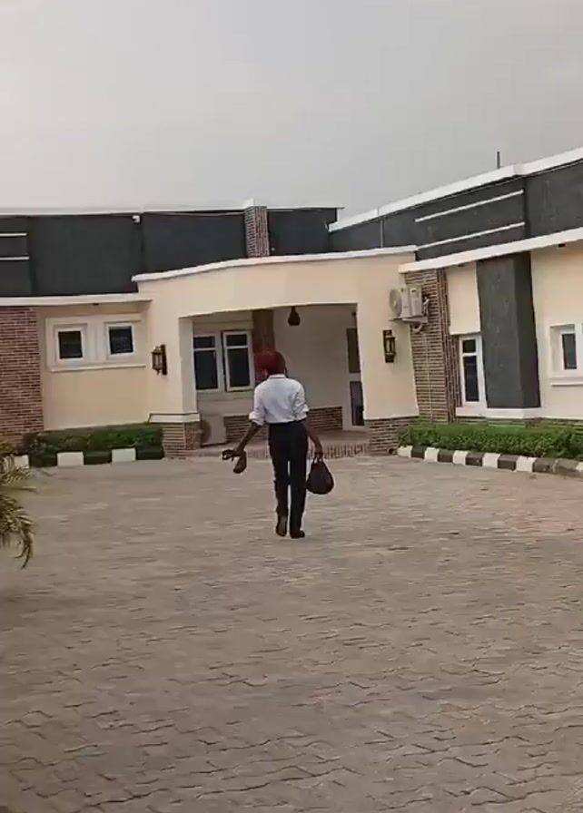 man walking across a paved courtyard. The man is wearing a white shirt, dark pants, and a red hat. He is carrying a dark bag in one hand and another object in the other. The courtyard is paved with light brown bricks in a herringbone pattern. There is a building in the background. The building is one-story and has beige and brown brick walls. There are several windows and air conditioning units on the exterior of the building. A staircase with green turf is located to the left of the frame. The sky is overcast.