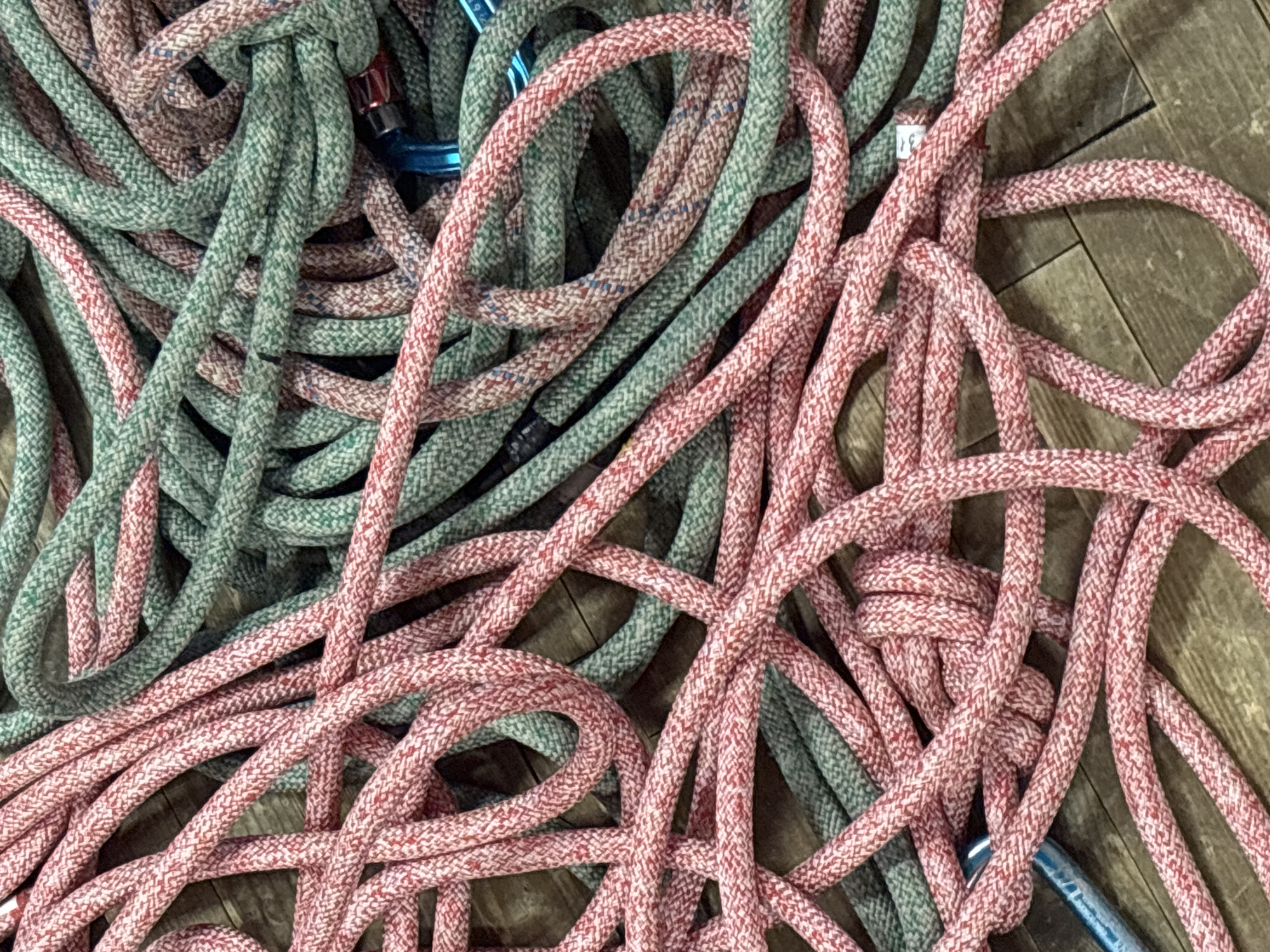 A cluttered arrangement of braided ropes, predominantly red-pink with white flecks and teal-green with multi-colored flecks, rests intermingled on a light brown wooden plank floor. Several metal carabiners, including blue and red-silver units, are partially visible among the tangled coils. The scene is static, depicting climbing or rigging equipment in disarray. This scene is located in the city of Tayshet, Russia.