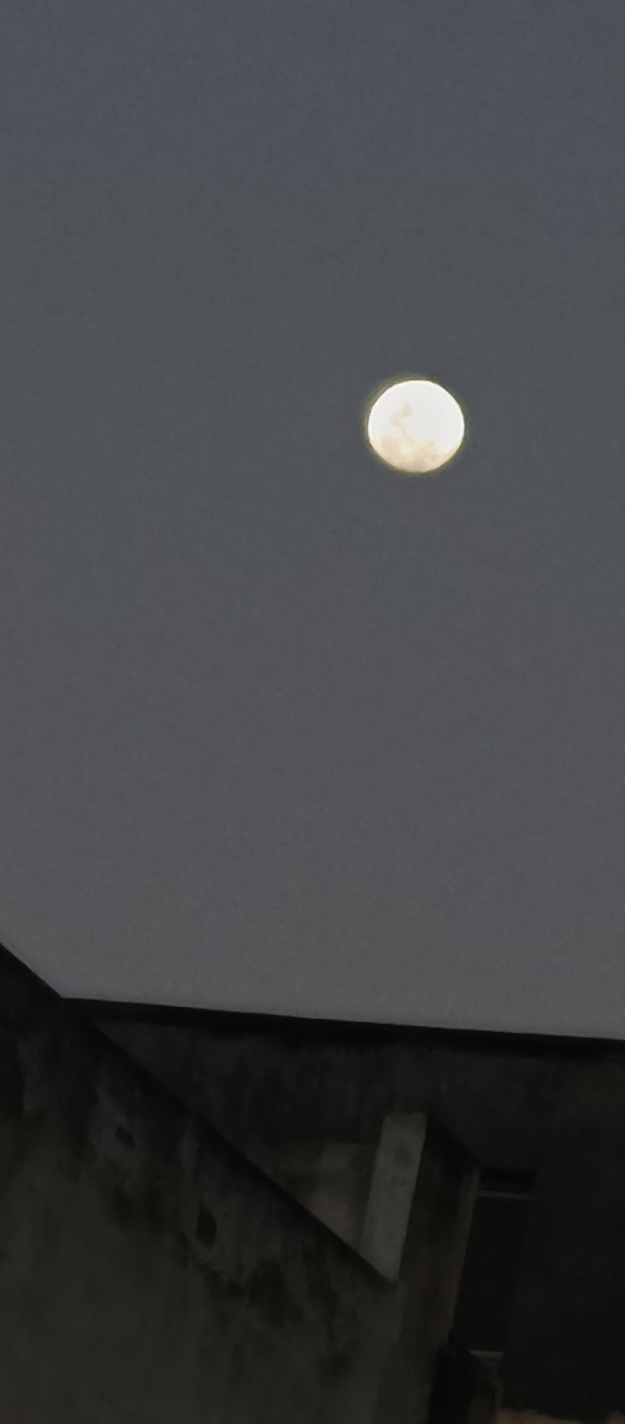 The image depicts a nighttime scene in Juan Griego, Venezuela. The upper two-thirds of the frame are filled by a dark grey sky, indicating low light conditions. Centered within this upper section is a prominent, circular, luminous white moon, appearing nearly full with discernible but soft surface features. The lower third of the image shows dark, silhouetted architectural structures. A horizontal dark line separates the sky from these structures, which include a dark, textured, angled surface extending from the lower-left, possibly a sloped roof or wall. To its right, a dark, lighter-toned vertical structural element, resembling a pillar or building corner, is visible, alongside a dark rectangular opening, consistent with a window or doorway on a building facade. No individuals, specific actions, or discernible interactions are present in the scene.