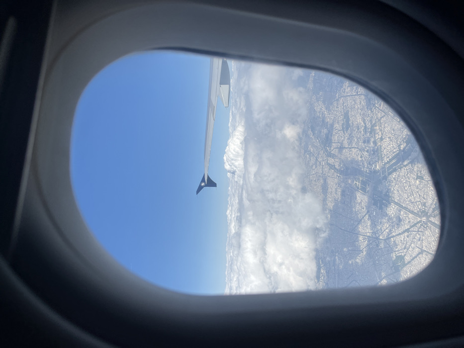 - "view from an airplane window, looking out over a cityscape and a layer of fluffy white clouds" by FM-si6Al2, licensed under CC BY 4.0