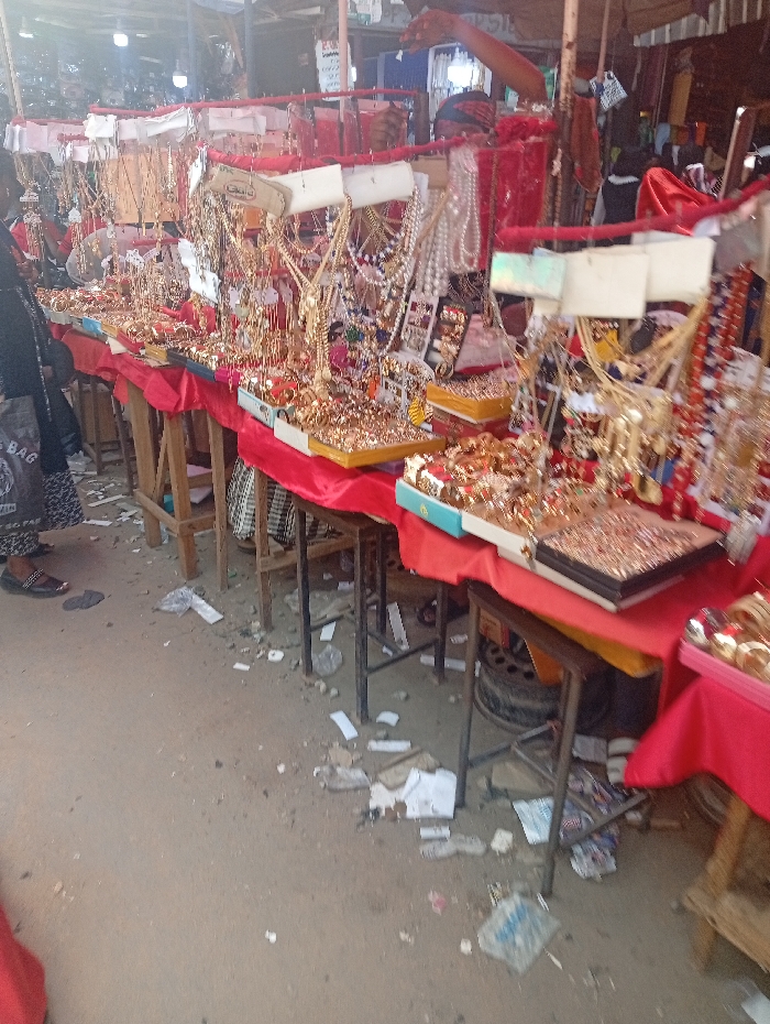 The image captures a market scene in Nkwelle, Nigeria. Multiple open-air stalls are arranged in a line, displaying a variety of costume jewelry, primarily gold-toned necklaces, earrings, and bracelets, along with some pearl-like designs. Each stall features a surface draped with red fabric, upon which the merchandise is arranged on stands, hanging from racks, and contained within open boxes. The support structures for these stalls are visible, consisting of simple wooden and dark metal frames. The ground in the foreground and beneath the stalls is unpaved earth, littered with various debris including paper scraps and plastic refuse. On the far left, the lower legs and feet of an individual, wearing dark sandals, are visible near a black and white patterned bag. In the upper background, an informal market canopy provides overhead cover, with visible support poles and hanging light fixtures. Indistinct figures and additional market activity are discernible in the blurred background, including a partial view of a mannequin arm on the upper right.