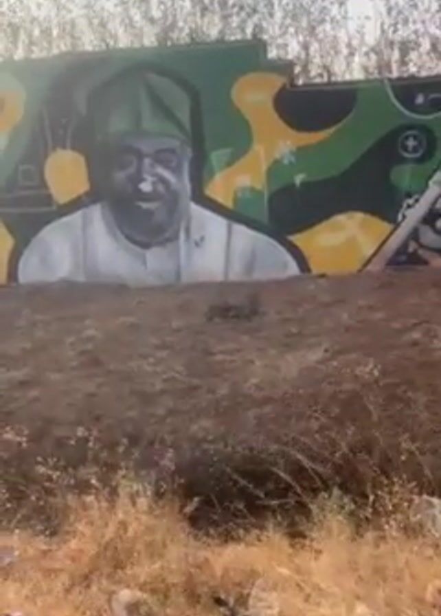 long mural on a wall next to an earthen embankment. The area in front of the wall is overgrown with brown, dead-looking grass. The mural features two grayscale portraits. On the right side is a man wearing a green cap and a white shirt. He has a slight smile. To the left of him is a shirtless man with something wrapped around his neck and chest. He's holding a long object to his mouth, possibly a pipe or a musical instrument. The background of the mural is filled with green, black, and yellow abstract shapes. The sky is visible above the wall, and the sun is shining brightly.