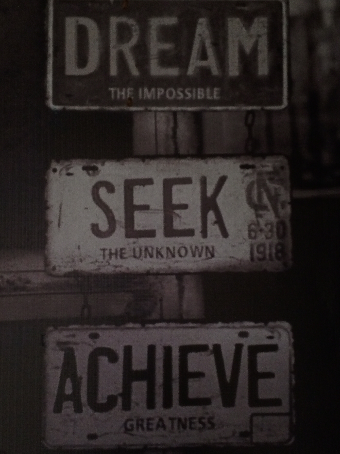 The scene in the city of Voa Yeav, Cambodia, depicts three vertically stacked, weathered rectangular signs, consistent with a display on a dark, possibly wooden, vertical surface. The overall tone is dark and desaturated. The topmost sign features a dark background with light-colored, capitalized text: "DREAM" prominently displayed, with "THE IMPOSSIBLE" centered below it in smaller font. This sign exhibits visible wear around its edges. Immediately below, the middle sign appears to be an aged, white or light-colored license plate with dark, capitalized text: "SEEK" in a large font, and "THE UNKNOWN" below it. To the right side, the numbers "6-30" are visible above "1918." Faint markings or a symbol are present to the left of these numbers. This sign shows significant distress, including chipped paint and surface irregularities. It is connected to the sign above by what appears to be a chain or wire. The bottom sign, also resembling an old, light-colored license plate, displays dark, capitalized text: "ACHIEVE" in a large font, with "GREATNESS" centered beneath it. This sign also shows signs of wear and aging. No individuals or active interactions are present within the frame. The immediate environment behind the signs is dark and indistinct, suggesting a shadowed area or an interior setting.