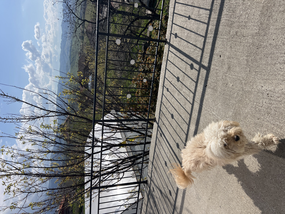 The image captures an outdoor scene in Djigurovo, Bulgaria, under a bright, partly cloudy sky. In the immediate foreground, a light-colored domestic dog, exhibiting dense, curly fur consistent with a Poodle or similar breed, walks from the mid-right towards the lower-left, facing the viewer. Its tail is curled upwards. The dog is positioned on a light gray concrete surface that shows strong, elongated shadows cast by a railing, indicating direct sunlight from the right. A dark metal railing with vertical bars, horizontal top and bottom rails, and decorative circular white elements runs horizontally across the midground. Behind this railing, a sloped area descends, revealing the reflective, translucent roof of a structure, possibly a greenhouse, positioned below and to the left. The background displays a hilly landscape characterized by numerous trees, some with emerging green leaves and others still bare-branched. Scattered residential buildings with reddish-brown roofs are visible among the vegetation on the hills, which extend towards distant rolling terrain under the blue sky dotted with white cumulus clouds.