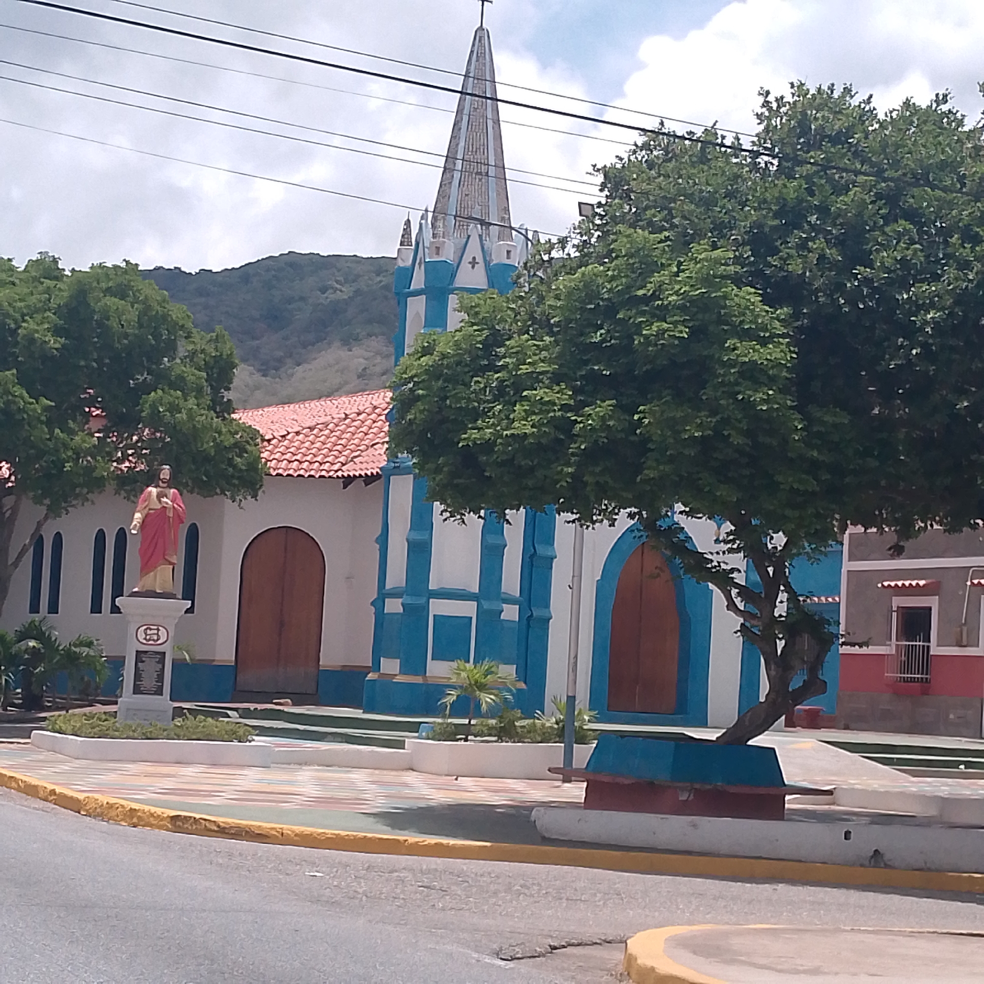 Iglesia de Tacarigua, a church in Tacarigua, Venezuela. The church has white walls with blue trim and a tall steeple. In front of the church is a statue of Jesus Christ. There are trees on either side of the church. The ground is paved with colorful tiles. A street runs in front of the church. There are power lines visible in the sky. A hill is visible in the background.
