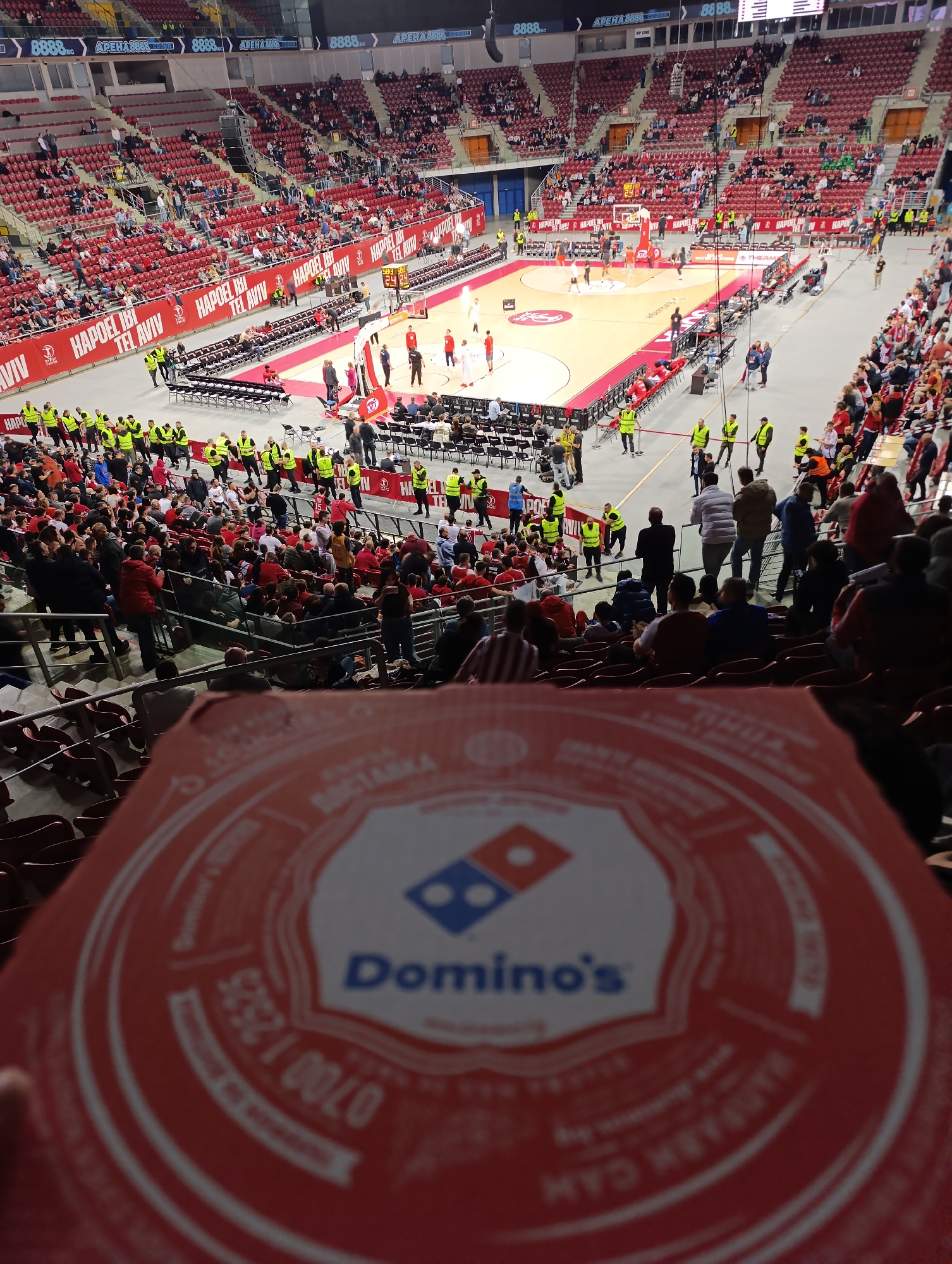 basketball game being played at what appears to be the "Arena Sofia" in Bulgaria. The arena is filled with spectators seated in red chairs. People are seated on all sides, with many wearing red and white. The game is in progress on a hardwood court marked with lines and a logo in the center. Numerous individuals wearing yellow jackets are present around the court and stands, presumably security personnel or event staff. A Domino's pizza box is prominently displayed in the foreground, partially obscuring the view of the basketball game, which is out of focus. Banners with the text "HAPOEL TEL AVIV" appear on the sides of the court. The score on the scoreboard is 58:3. The upper tiers of the arena feature advertising banners.