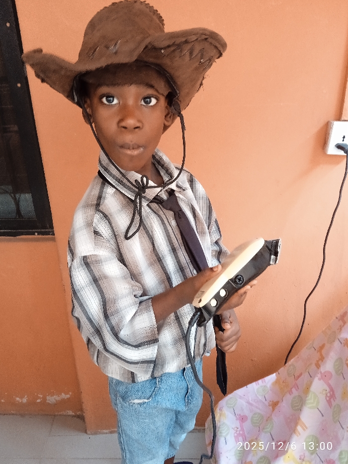 A young boy, situated in Agege, Nigeria, stands centered against a peach-colored wall, looking directly at the camera with a neutral expression. He wears a brown, faux-suede cowboy hat, a long-sleeved, horizontally and vertically striped plaid shirt in shades of white, grey, and black, a dark solid-colored tie, and light blue ripped denim shorts. He holds a two-tone electric hair clipper (light cream top, black base) with a black power cord in both hands at waist level. To the left, a portion of a dark window or door frame is visible. To the right, a white electrical outlet is mounted on the wall, with a black cord plugged into it. A white fabric with a repeating pattern of pink and green cartoon animals is partially visible in the lower right foreground. A digital timestamp "2025/12/6 13:00" is superimposed on the lower right corner of the image.