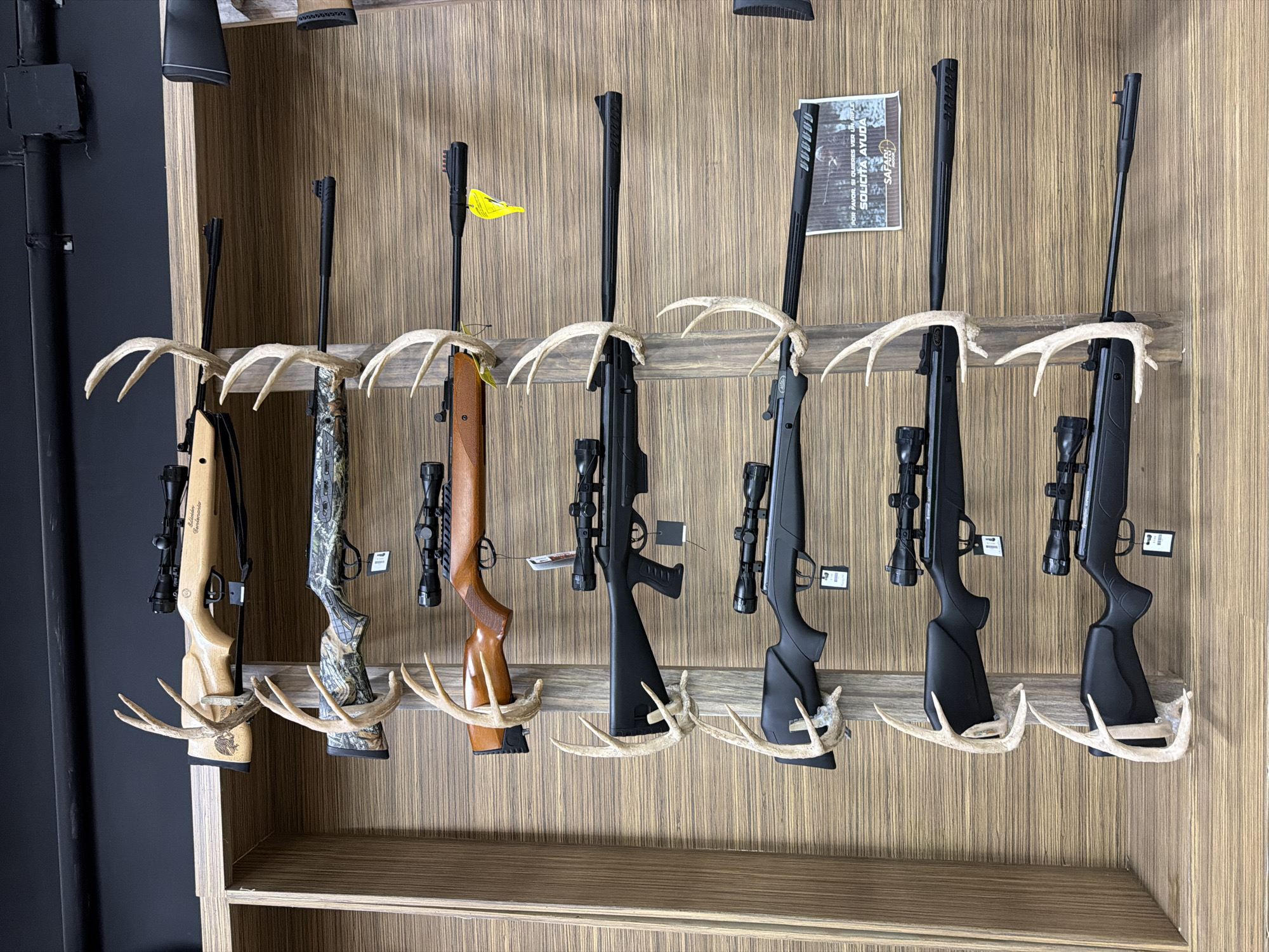 A retail display in San Pedro Cholula, Mexico, features seven air rifles mounted on a wooden shelf unit. The rifles are supported by sets of deer antlers attached to the shelf's vertical supports. The rifles vary in color and material, including natural wood, synthetic, and camouflage patterns. Each rifle is equipped with a scope. A single shelf is visible below the hanging rifles. A black wall is seen to the left of the display unit.