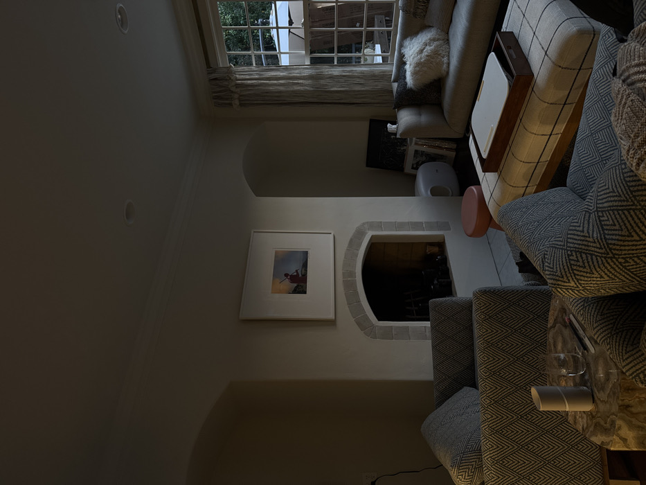 The image captures a cozy living room scene. A fireplace with a white-framed painting beside it is a focal point. Furniture includes a grey patterned sofa, a small stool, and an arm chair with a side table with glasses on it. The room is bathed in natural light from a window with a curtain.