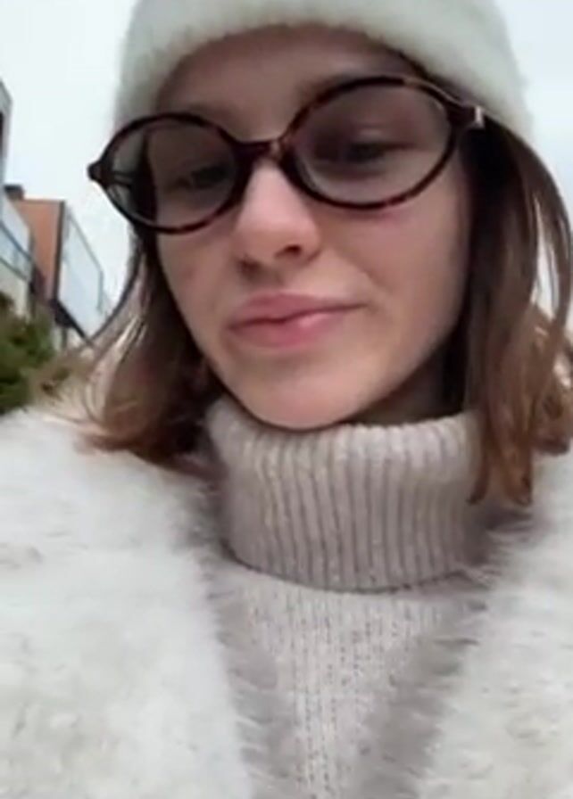 A young woman wearing a white beanie, eyeglasses, a cream-colored turtleneck sweater, and a white fur jacket is recording a video outdoors. She is holding a bag of bread. Buildings and a cloudy sky are in the background.