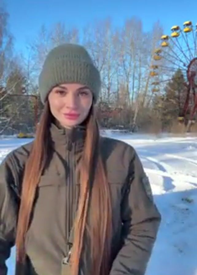 A woman stands in a snowy field on a sunny day, a rusted ferris wheel in the background. She wears a green knit cap, a green jacket with patches, and a matching green shoulder bag. She has long brown hair and is looking at the camera. She then poses with her hands clasped under her chin.