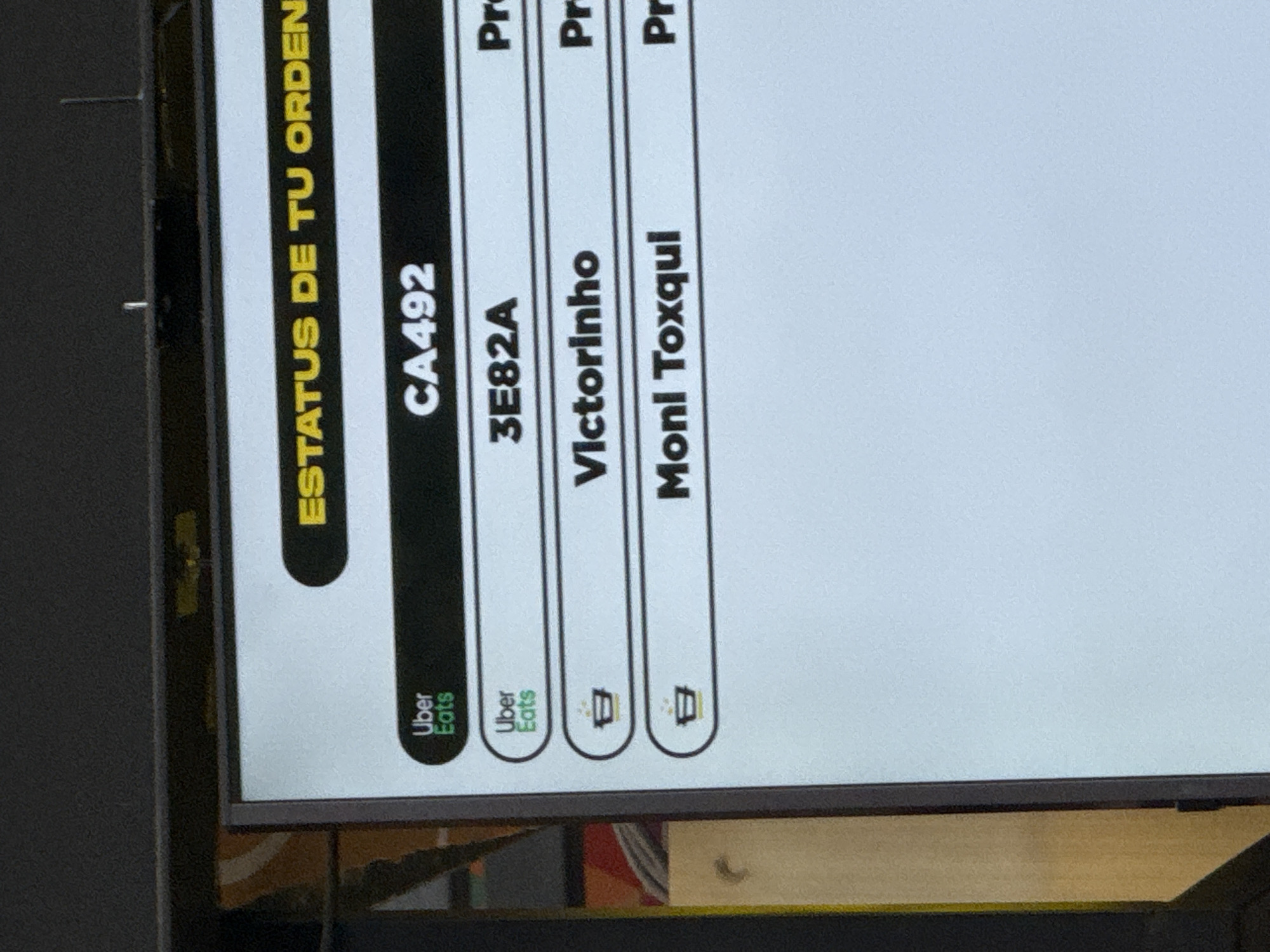 A digital display screen, oriented vertically, presents an order status board in what appears to be a commercial food service establishment located in Puebla, Mexico. The screen features a dark bezel. The top section of the display shows a black banner with "ESTATUS DE TU ORDEN" (STATUS OF YOUR ORDER) in yellow capital letters. Below this, a list of orders is visible against a light blue/white background. Specific entries include: * A black bar displaying "CA492" in white text. * A subsequent entry showing "3E82A" with a green "Uber Eats" logo encased in a rounded black rectangle. * An entry labeled "Victorinho" with a small yellow bowl icon. * An entry labeled "Moni Toxqui" also with a small yellow bowl icon. * Partial text "Pr" is visible to the right of "Victorinho" and "Moni Toxqui", likely indicating "Prepared" or "Preparing." The left side of the screen's frame reveals a light-colored wooden or laminate panel. No individuals are present in the frame, and no specific actions are depicted beyond the static display of order information. The environment suggests an indoor, public-facing area for order management and customer information.