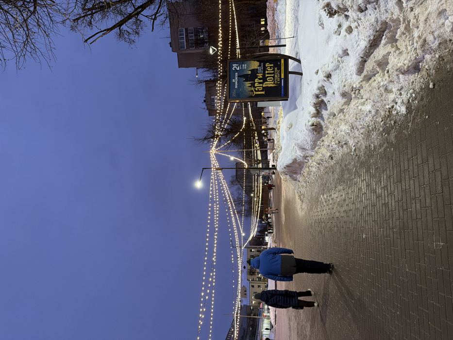 The image displays an evening scene on a brick-paved walkway in Sof'ino, Russia. The sky is a dark blue-grey. Numerous strands of warm-toned decorative string lights are suspended overhead, creating an illuminated canopy across the scene, complemented by multiple modern streetlights emitting bright white light. To the right of the paved path, significant accumulations of dirty, melting snow are visible, forming irregular banks. Further right, a snow-covered area contains several bare-branched trees. A prominent vertical billboard stands on the right side of the path, advertising "Harry Potter: Journey into the World of Music," with text in both Russian and English, along with the number "21" and times "15:00 - 18:00". In the foreground, two individuals are walking away from the camera on the paved path: one, positioned to the right, wears a blue winter jacket and dark pants; the other, to the left, wears a dark quilted winter coat, dark pants, and a dark hat, carrying a dark bag. Several other indistinct figures are visible walking further down the illuminated pathway in the midground. Multi-story buildings, some with lit windows, are discernible in the background.