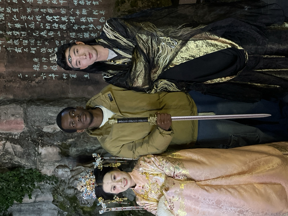 Three individuals pose together. One, dressed in a black and gold robe, stands near a stone wall inscribed with Chinese characters. Below, a person in a tan jacket holds a sword. At the bottom, a person in a traditional pink and gold outfit with ornate headwear smiles. Greenery is seen to the lower left and parts of a stone facade appear in the background.