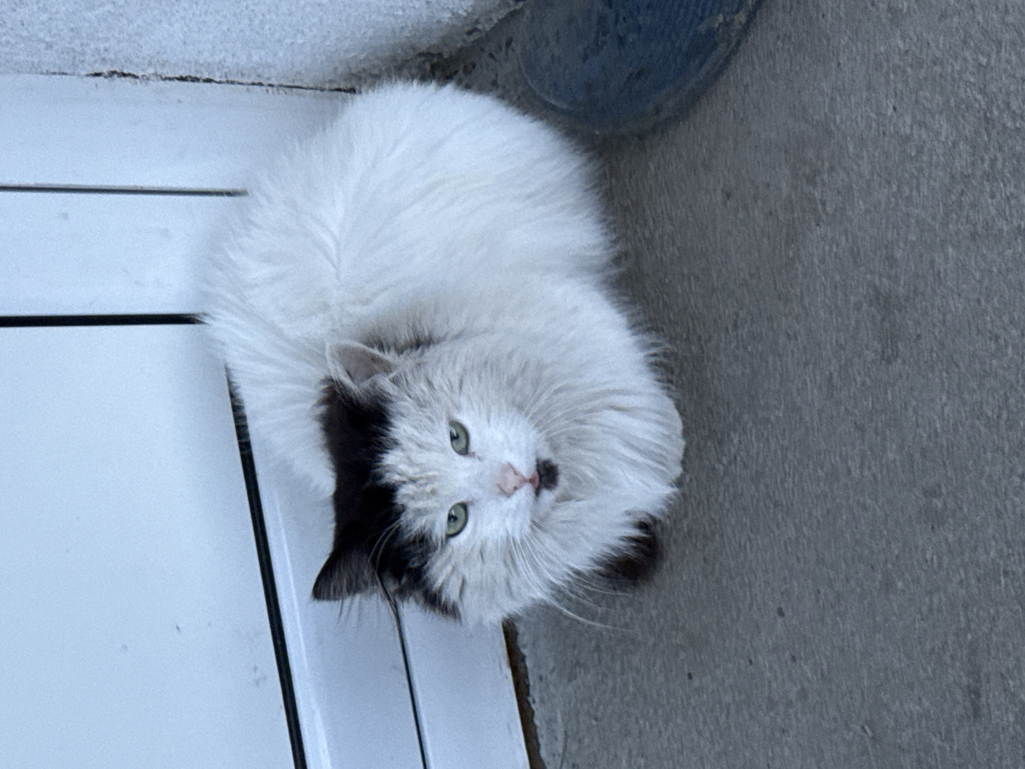 A fluffy, predominantly white and black bicolored cat sits on a gray concrete surface, looking directly at the viewer