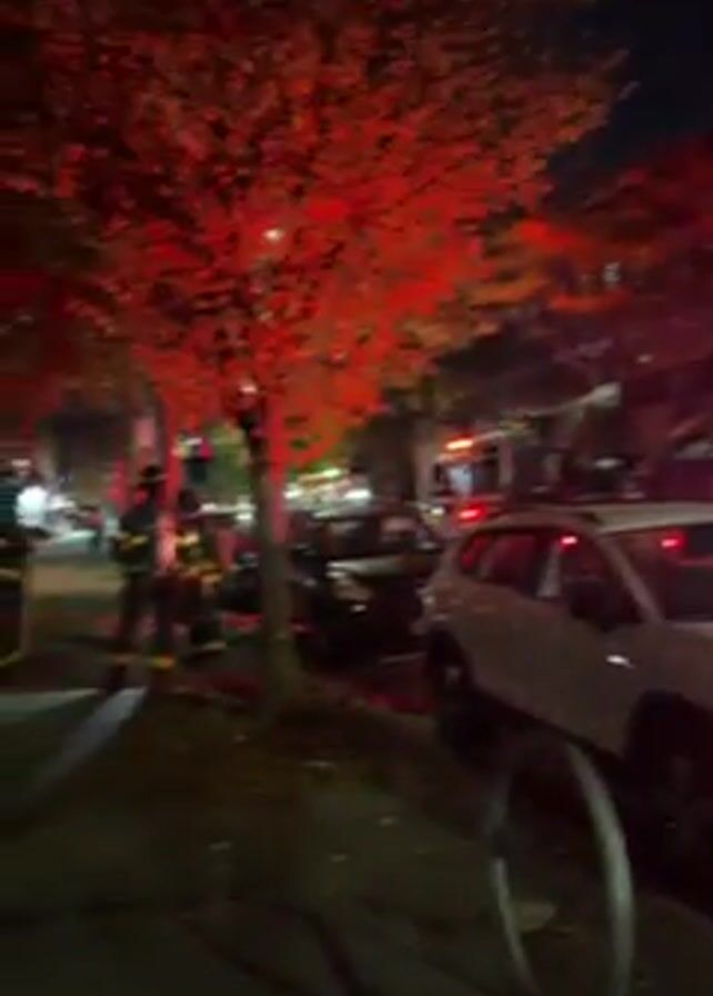 street scene at night, illuminated by the red flashing lights of emergency vehicles. Firefighters in full gear are standing on the sidewalk, some holding equipment. Cars are parked along the street, and trees line the sidewalk, their leaves reflecting the red emergency lights. The scene suggests a possible fire or emergency situation.