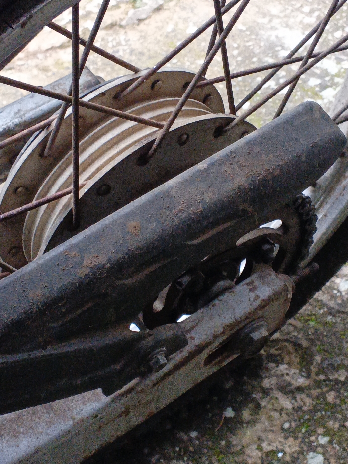 - "The image displays a close-up, low-angle view of the rear wheel and drive components of a motorized two-wheeled vehicle, situated on a mottled concrete or paved surface in Kyauk Hsoke, Myanmar" by FM-HDizq2, licensed under CC BY 4.0