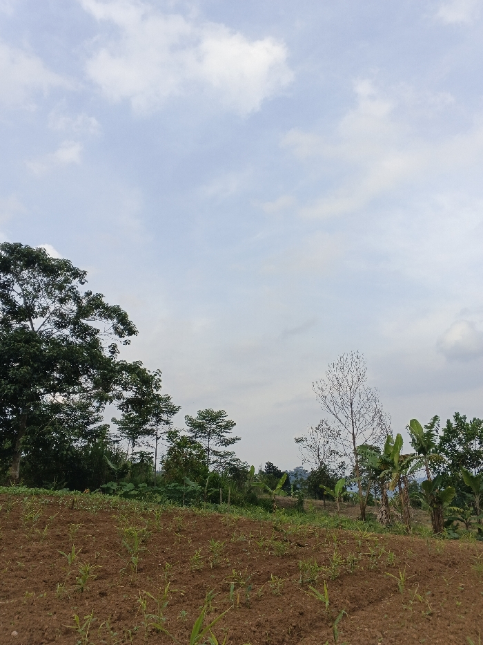 This image depicts a rural agricultural area within or near Chengdu, China. The foreground is dominated by tilled brown earth, planted with numerous small, green, herbaceous sprouts, consistent with young crops. No individuals are present. The midground features a dense line of diverse vegetation, including several tall, leafy green trees on the left, a cluster of slender, upright trees (possibly young pines) in the center, and several broad-leaved banana plants on the right. A prominent, bare, deciduous tree with numerous fine branches, devoid of leaves, stands centrally in the midground. The background reveals undulating green hills partially obscured by vegetation. The sky above is light blue-grey, overcast with scattered white clouds. No actions or interactions are depicted. The scene is a static landscape devoid of human activity.
