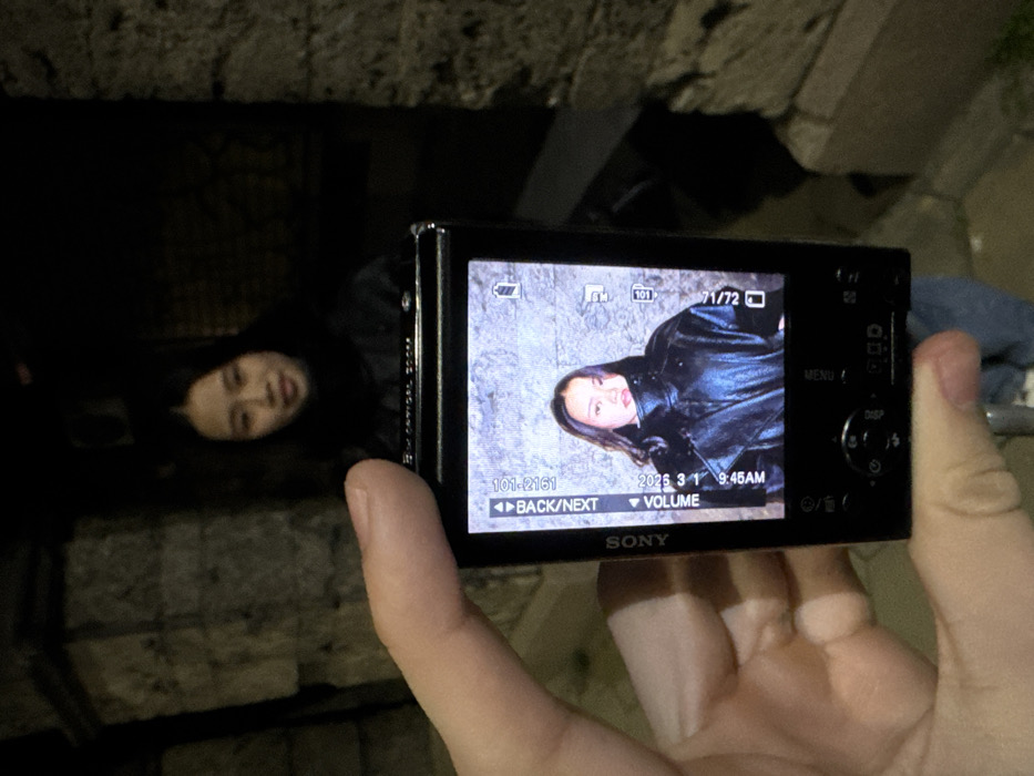 A close-up shot depicts a fair-skinned hand holding a black Sony compact digital camera. The camera's screen displays a frontal portrait of a young woman with dark hair, wearing a black, high-collared jacket, set against a light grey, rough-hewn stone wall. The digital interface visible on the screen includes the date "2015 3 1" and time "9:45 AM". In the background, beyond the camera, the same young woman is present, out of focus, standing in a dimly lit setting. The surrounding environment consists of dark, textured stone architecture, consistent with the ancient structures found in the **Old Town of Plovdiv, Bulgaria**. The woman in the background faces forward with a faint smile.
