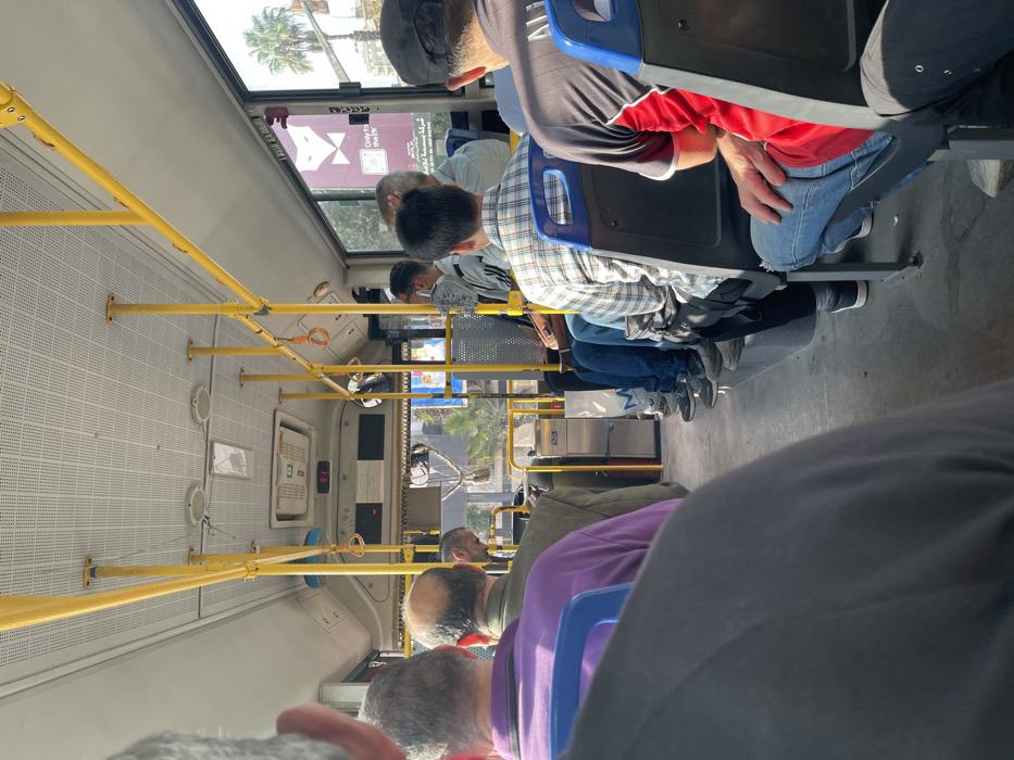 interior of a bus with several passengers seated. Yellow handrails run along the ceiling. Most passengers appear to be men, with a range of clothing styles visible, including plaid shirts and red tops. The bus interior is predominantly white and grey. A window shows a palm tree and buildings outside, suggesting an urban or suburban setting. The foreground is blurred by the back of a seat and a passenger.