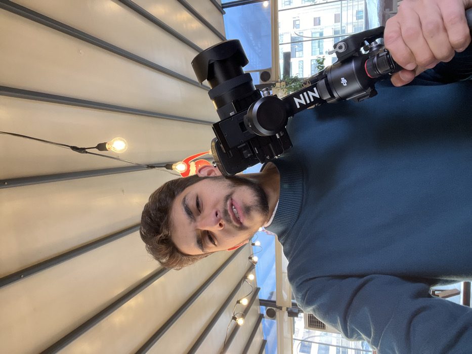 A young adult male, with dark hair and a short beard, is depicted in a medium close-up, facing the camera directly with a neutral expression. He wears a dark teal turtleneck sweater over a white undershirt. He holds a black professional camera mounted on a black DJI NIN gimbal stabilizer in his right hand. The camera features a lens with a hood. The immediate environment is an indoor or semi-outdoor commercial establishment, likely a cafe or restaurant, characterized by a light-colored, ribbed ceiling structure from which multiple exposed filament light bulbs are suspended. A decorative red object is also visible hanging from the ceiling. In the background, visible through glass windows or an open section of the establishment, are multi-story urban buildings, a clear blue sky, and some sparse greenery. An air conditioning unit is partially visible on the left. The scene is located in Kafr Sousa Municipality, Syria.