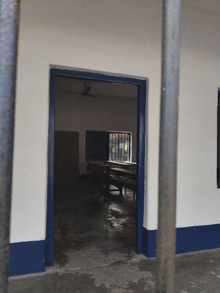 A classroom is visible through a blue-framed doorway, partly obstructed by what appears to be bars