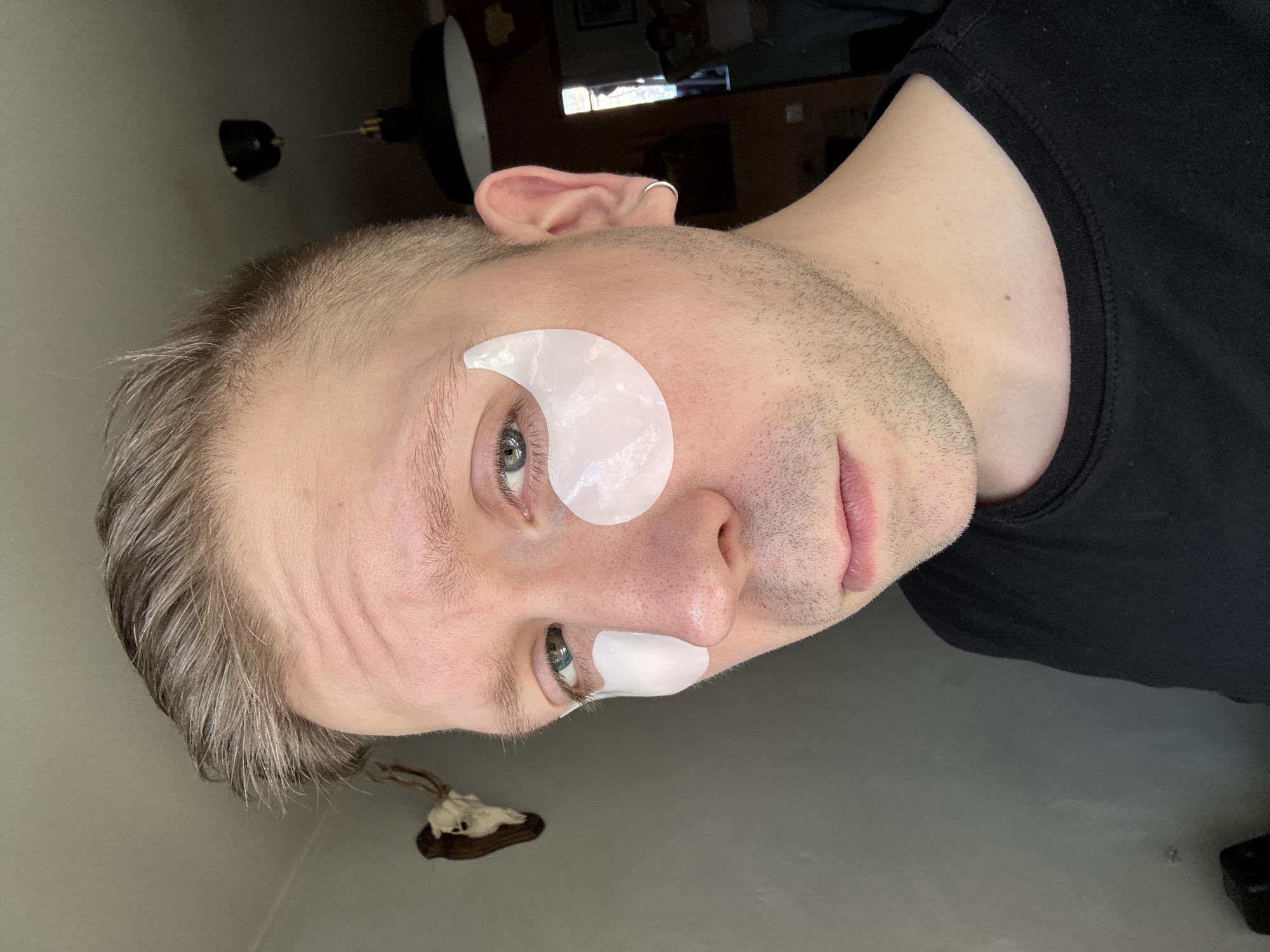 A Caucasian male subject, appearing to be in his late 20s to early 40s, is depicted in a medium close-up, gazing directly forward. He has short, light brown hair with visible grey streaks, blue eyes, and light stubble on his lower face. Two white, pearlescent, crescent-shaped under-eye patches are applied beneath each eye. He is wearing a plain black crew-neck t-shirt, and a small silver hoop earring is visible in his left earlobe. The background consists of a plain light grey wall to the left, upon which an animal skull, mounted on a dark wooden plaque, is affixed. To the top right, a black, bell-shaped hanging lamp fixture is visible. A partially obscured, dark doorway or opening is present on the far right, revealing a blurry, light-colored silhouette of a person within. The scene is an indoor setting.