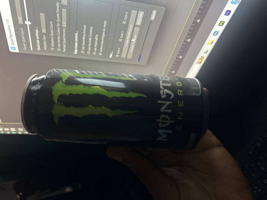 A right hand with dark skin tone holds a black Monster Energy drink can, featuring a prominent green "M" logo and "MONSTER ENERGY" text, centered in the frame. The can's top is visible and sealed. To the right of the hand and can, a computer monitor displays a user interface for a 3D software application, specifically "Quad Remesher 1.0." Visible elements on the screen include "Target Quad Count 5000," "Quad size settings," "Edge Loops control" options (such as "Use Smoothing Groups" and "Detect Hard-Edges by angle"), and "Misc" options like "Create MultiMaterial" and "License Manager" buttons. A horizontal timeline with numerical markers (e.g., 25, 30, 35, 40) is present at the bottom of the monitor display. Partially visible icons on what appears to be a taskbar or dock include "Ps" (likely Adobe Photoshop) and "Pr" (likely Adobe Premiere Pro). A segment of a dark keyboard is visible in the lower-left foreground. The scene is dimly lit, with the monitor serving as the primary light source, illuminating the right side of the image while the left side, including much of the hand and parts of the can, remains in shadow. The image does not contain discernible elements to identify a specific location within Abuja, Nigeria.