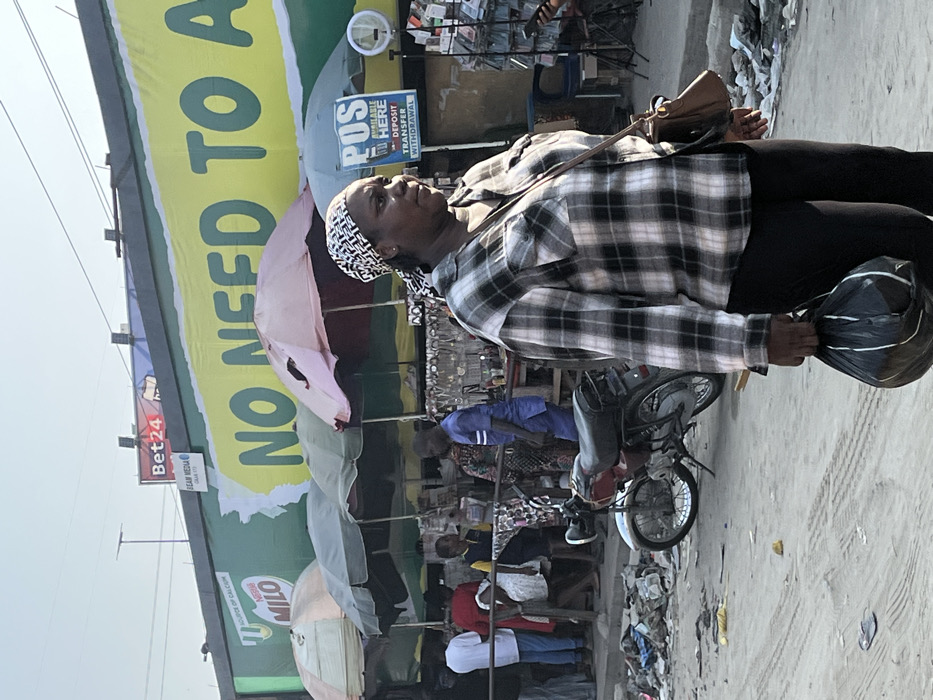 A woman in a plaid shirt and headscarf stands near a motorcycle on a busy street. The street is lined with shops and vendors under umbrellas. A large advertisement for Bet24 and Milo is visible in the background. The ad also features a sign that says "POS Available Here". There is visible litter on the ground.