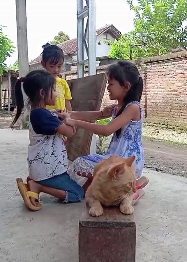 two young girls playing with each other while a third child stands behind them. The girls are holding hands in what appears to be a playful manner. An orange cat sits on a concrete ledge, partially obscured by the girl on the right. The girl on the right stands and then kneels while petting the cat. The setting appears to be an outdoor area, possibly a yard or patio, with a brick wall and some greenery in the background. The area is covered by a metal roof. A wooden plank is nearby. The children are dressed in casual summer clothes, and the cat appears relaxed.