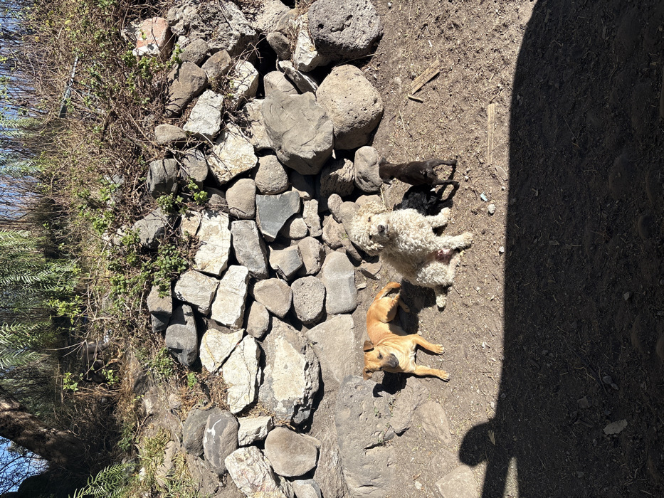 Three dogs rest outside by a stone wall. A tan dog with short hair lays stretched out on the ground next to the wall. A white, curly haired dog lays on its back, relaxed. A small black dog sleeps under the white dog, in the shade near some rocks. The area around them is a mix of dirt, small pebbles, and some greenery near the wall's base. Part of the image is cast in shadow.