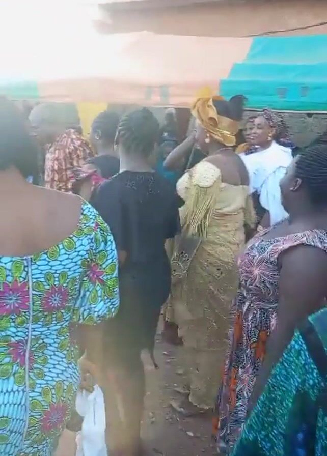 group of women gathered outside, possibly at an event or celebration. Many are dressed in colorful African print dresses, while others are in more modern attire. A woman in an elaborate gold gown and headwrap stands out. There appears to be music playing and some people are dancing or moving to the rhythm. There is a blue and orange canopy overhead and the surroundings look like a yard or outdoor space next to a building.