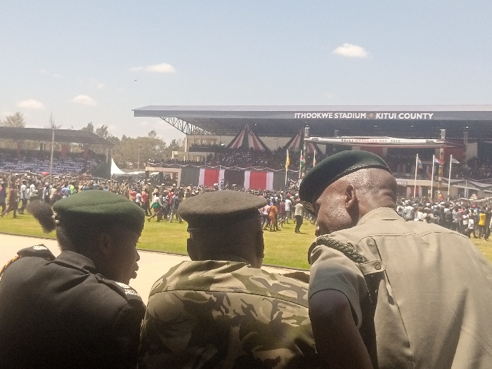 The image depicts a large public gathering at Ithookwe Stadium in Kitui County, Kenya, under a clear, bright sky with scattered clouds