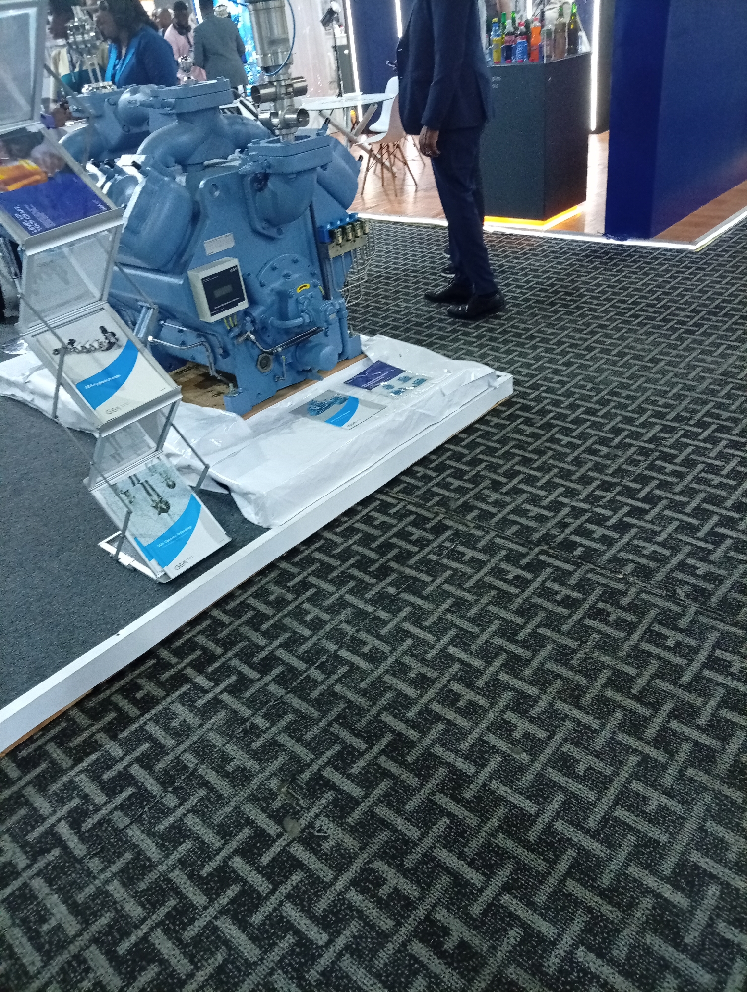 The scene depicts an indoor exhibition space in Alaguntan, Nigeria. The floor is covered with a dark grey patterned carpet featuring a repeating geometric design. In the foreground and midground on the left, a raised platform presents two large, light blue industrial machines, possibly compressors, equipped with piping, valves, and control panels. White protective covering partially surrounds the base of these machines. Two silver-colored display racks on the platform hold brochures featuring "GEA Hygienic Pumps" and "GEA Cleaning Technologies." In the midground on the right, a male individual stands facing right, wearing a dark blue suit and black dress shoes. In the blurred background, multiple individuals are visible, including a woman in a blue top near the machinery. Further back, a dark display counter with an illuminated yellow base holds various bottles, suggesting a beverage station, adjacent to a dark blue vertical panel. Tables and chairs are also visible in the far background.
