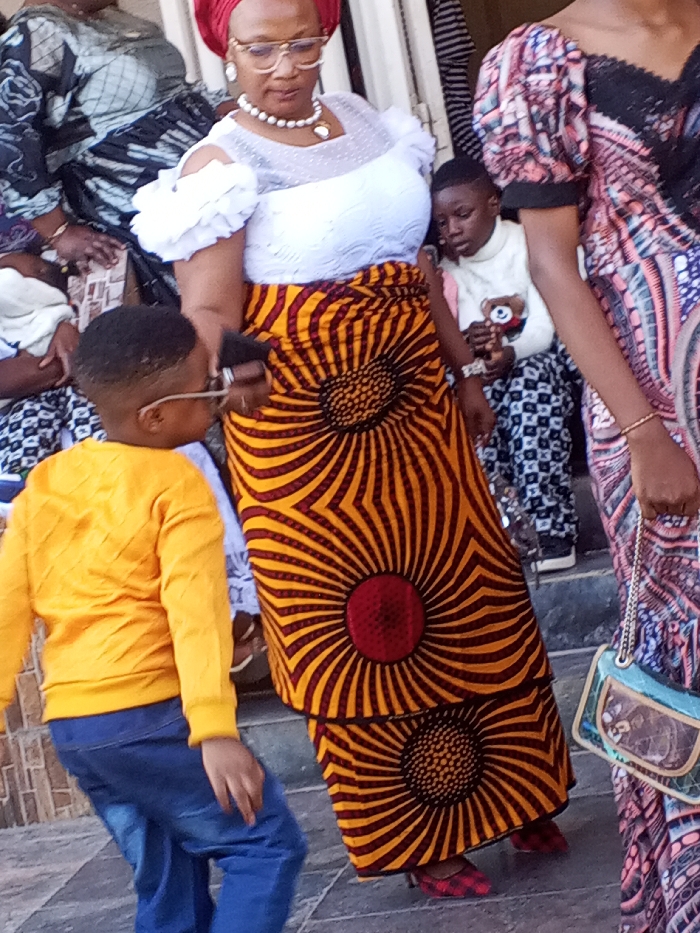 The image depicts an outdoor or semi-outdoor gathering in Sabon Gari West, Nigeria. In the central foreground, an adult female is featured, wearing a red headwrap, light-framed eyeglasses, a white off-shoulder blouse with ruffled sleeves, and a pearl necklace with a gold pendant. Her lower attire consists of a long, ankle-length wrapper skirt patterned with radial yellow and dark red stripes converging into two large circular motifs. She wears red and black plaid shoes and holds a dark object in her right hand. To her immediate left, a young boy, seen from behind and facing the central woman, wears a yellow long-sleeved shirt, blue jeans, and light-colored eyeglasses. Behind the central woman and to her right, a young boy sits, dressed in a white turtleneck shirt and black and white patterned trousers, holding a small brown teddy bear. Partially visible on the far right is another adult female wearing a colorful patterned dress with puffed sleeves and carrying a light blue and brown crossbody bag with a silver chain. A fourth adult female in a patterned garment is partially visible in the upper left background. The ground is paved with grey interlocking stones or tiles.