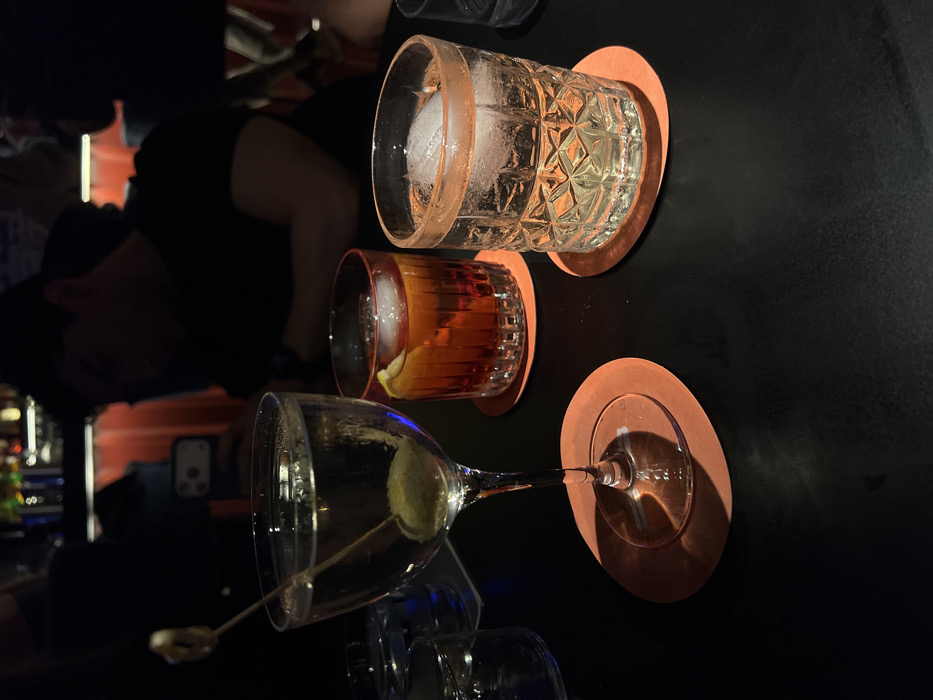 Three drinks rest on coasters atop a dark, reflective surface. The top drink is clear with a large ice ball in a textured glass. The middle drink is amber-colored with a lemon peel. The bottom drink is in a stemmed glass with an olive garnish. A bar-like setting is reflected in the surface, showing a person and interior details.