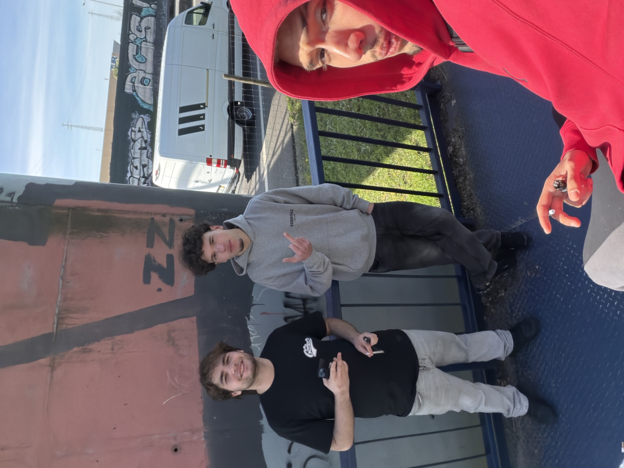 Three young adult males are depicted on an elevated platform with a dark blue diamond-plate floor and a matching metal railing. The subject on the left is a Caucasian male with short brown hair, wearing a black short-sleeved t-shirt with a white graphic logo, light grey jeans, and black shoes. He smiles, holding a black smartphone in his left hand and a set of keys with a silver key in his right hand. The subject in the middle is a Caucasian male with dark curly hair, wearing a light grey hooded sweatshirt with "ESSENTIALS" text on the chest, dark jeans, and black sneakers. He stands with his left hand in his pocket and his right hand raised, displaying an inverted V-sign with his index and middle fingers. His expression is neutral. The subject on the right, partially visible in a close-up, is a Caucasian male wearing a bright red hooded sweatshirt. He is taking the photograph, holding a lit cigarette between his right index and middle fingers, with a vape device also in his right hand. His lips are slightly parted. Behind the subjects is a large, weathered vertical structure, painted reddish-brown and dark grey, bearing black graffiti, including the letters "ZZ". Beyond the railing, a paved road is visible, where a white Mercedes-Benz Sprinter van with dark vertical stripes and "J L E" branding on its side is parked or driving. In the far background, a wall covered with graffiti, including "ACS", stands before industrial structures, utility poles, and a distant sign displaying "ZUR". The sky is clear blue. The industrial and port-like environment, including the large structure, the white van, and the "ZUR" sign, indicates a location within the Port of Leixões or an adjacent industrial zone in Matosinhos, Portugal.