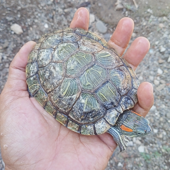 A person holds a red-eared slider turtle in their palm. The turtle's shell is patterned with green, yellow, and black, and its head shows distinctive red markings. The person's hand appears slightly wet, and the background is a mix of gravel and dirt. The focus is sharply on the turtle and hand, highlighting the intricate details of the turtle's shell and markings.