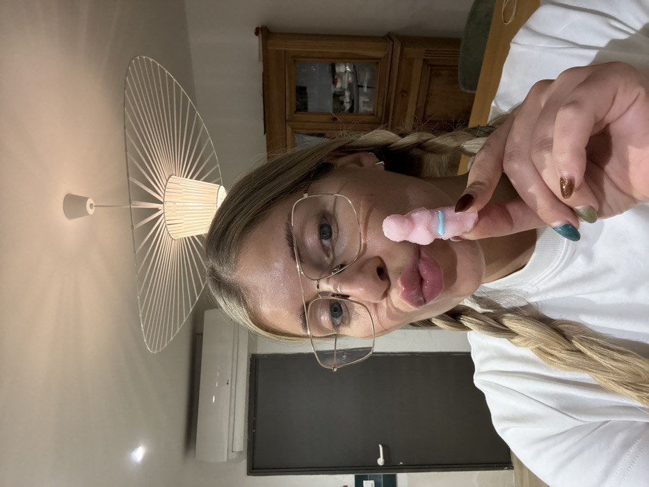 - "A woman with blonde braided hair and glasses holds a pink sugary candy with a blue stripe in front of her face" by FM-OZmdD3, licensed under CC BY 4.0